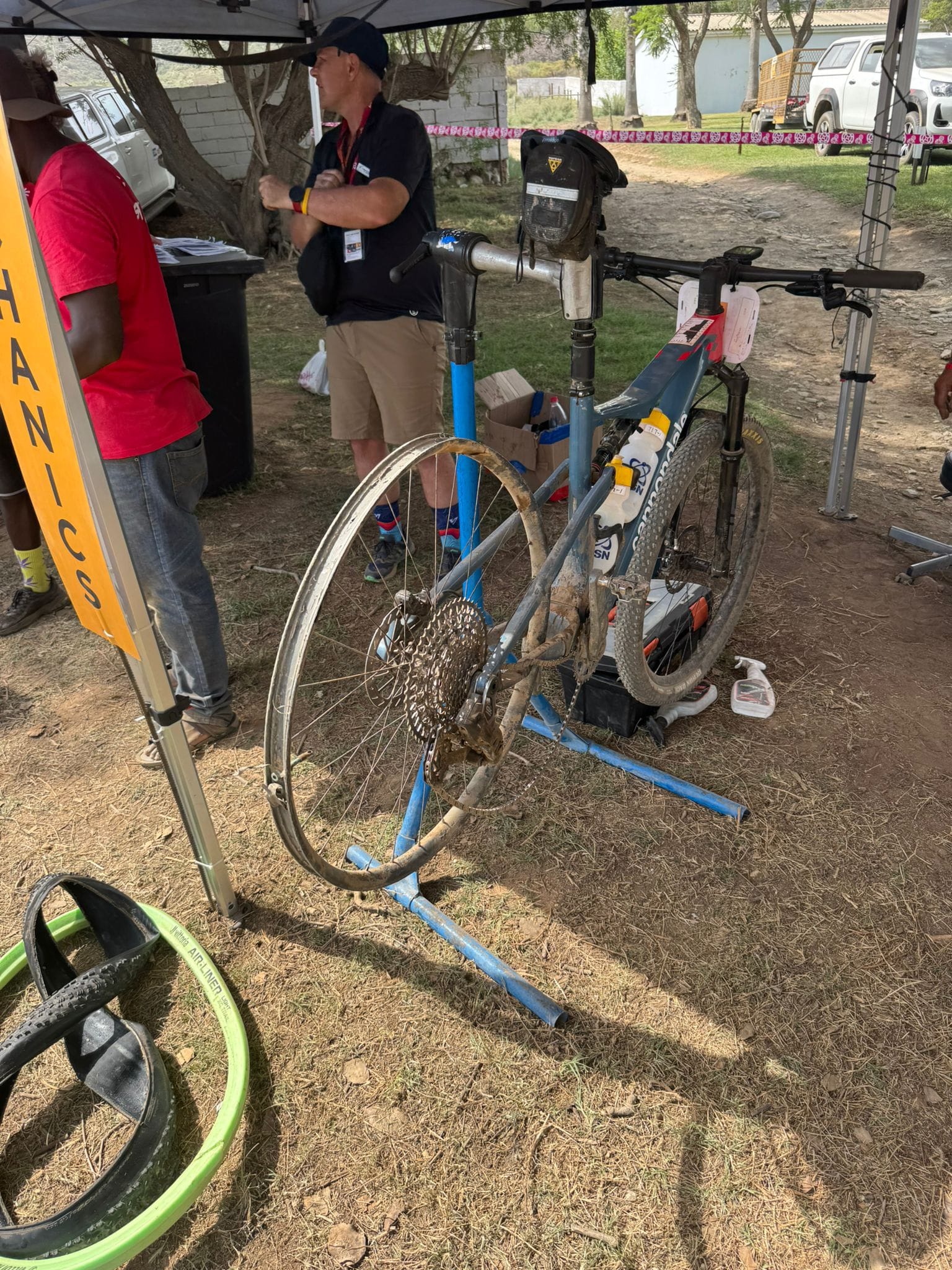 At the water point, they had a rim. Progress. Except the cassette on the replacement rim didn't match mine, so they had to go fetch another one. We sat there for the better part of an hour. In the grand scheme of an already derailed stage, it barely mattered.